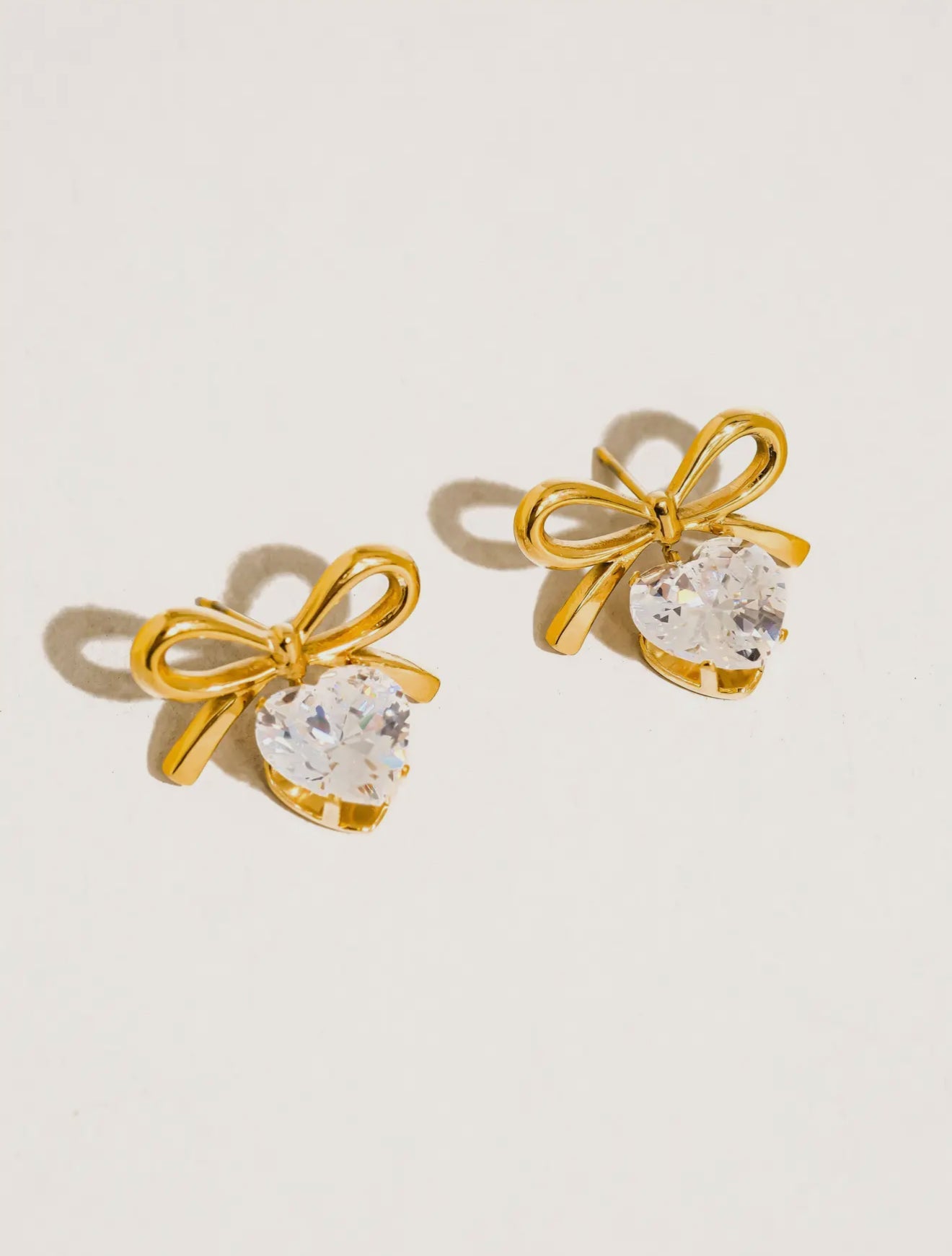 Sweetheart Drops feature a dainty gold bow with a tiny heart-shaped CZ that subtly dangles beneath — giving the prettiest sparkle with every movement. Feminine, playful, and instantly polished for everyday wear or a night out.
