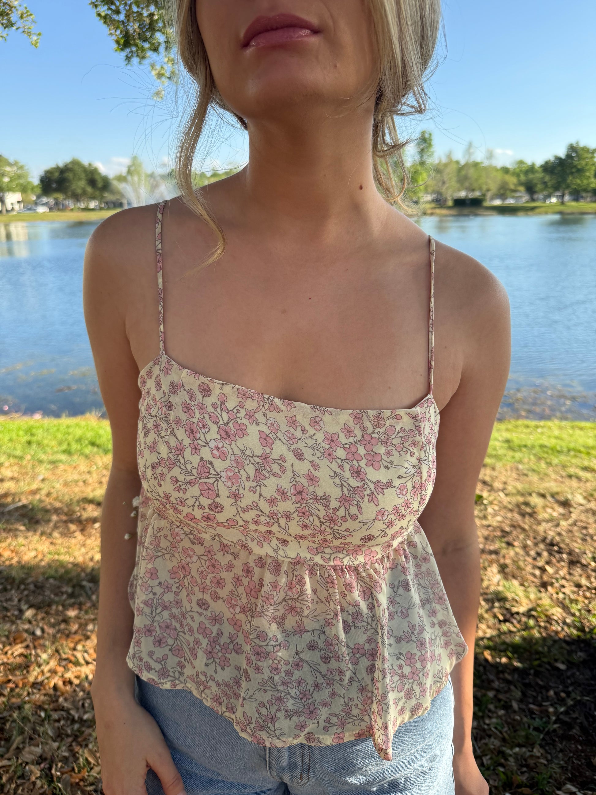 Say hello to your next soft girl staple: the Sweet Pea Top. This cami features a romantic square neckline, open back with adjustable tie straps, and a lightweight double-layered fabric that floats with every step. The delicate pink floral print gives it that soft, springtime charm, while the 100% polyester fabric keeps it light and breezy all day long. Whether paired with denim, a mini skirt, or layered under your favorite cardi, the Sweet Pea Top adds a flirty, feminine touch to any outfit.