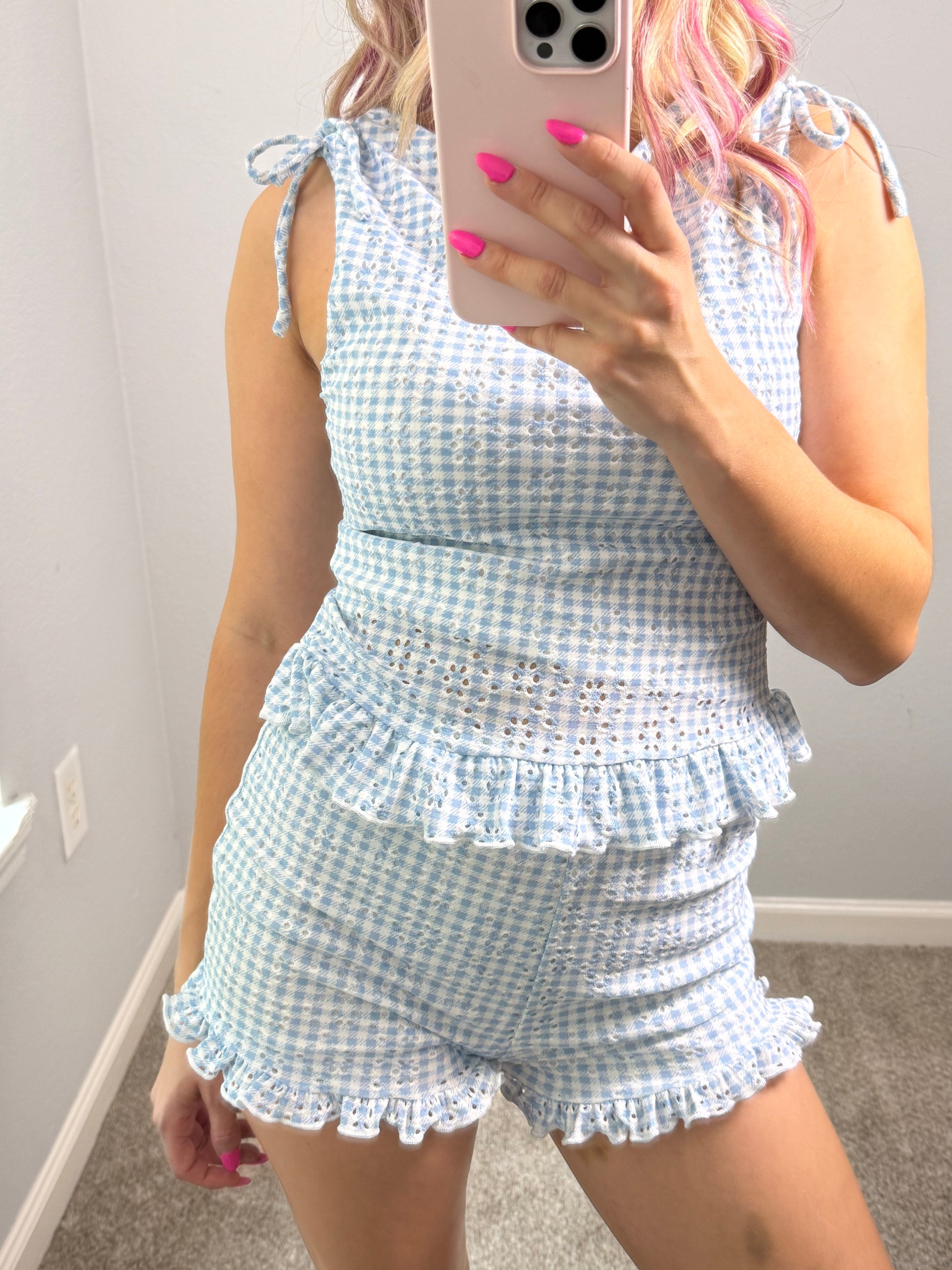 Sweet with a little sass, the Bluebelle Set is made for summer moments. Featuring a ruffle crop top with tie straps and matching eyelet shorts, this two-piece set brings flirty Southern charm to your wardrobe.