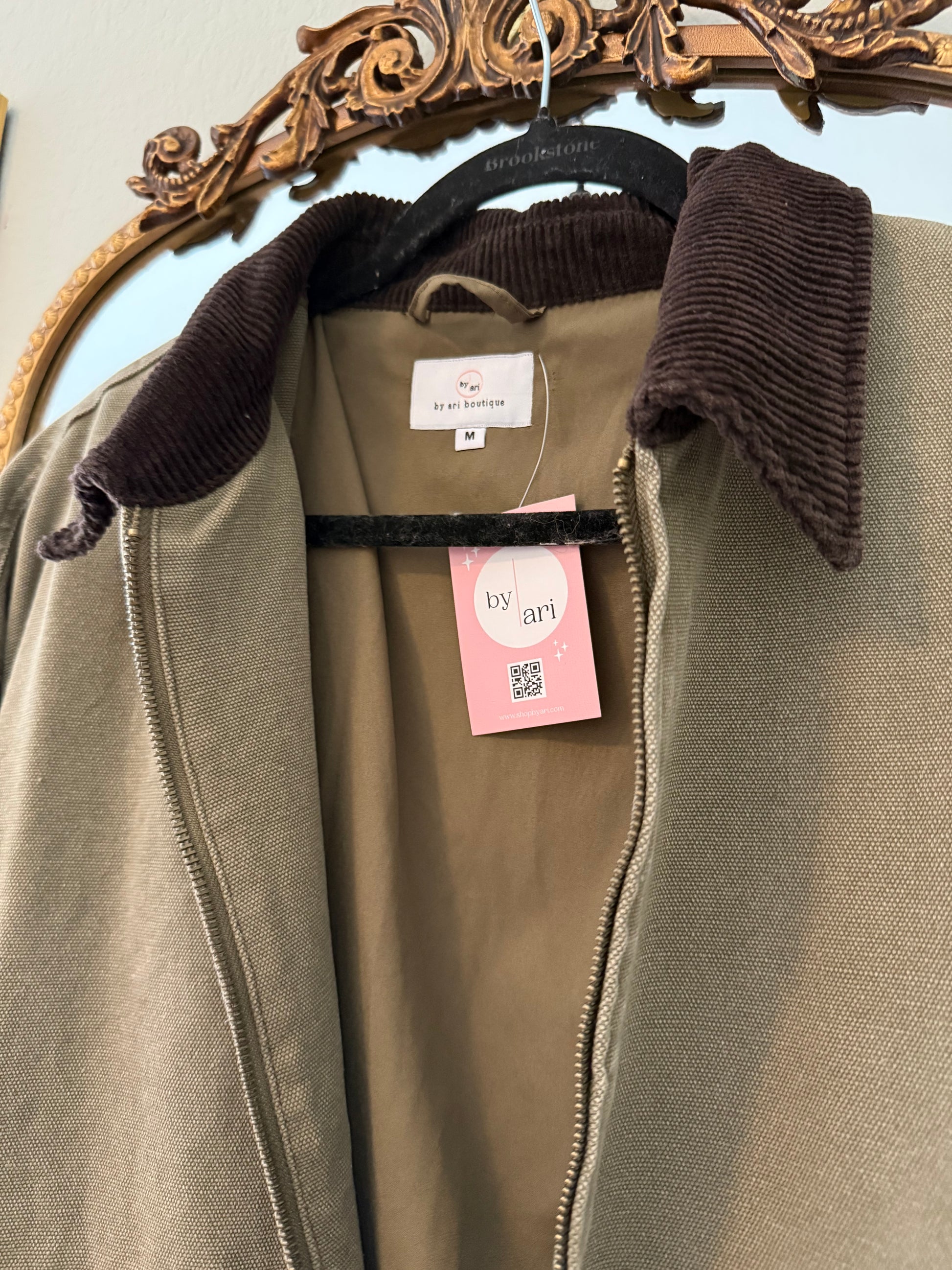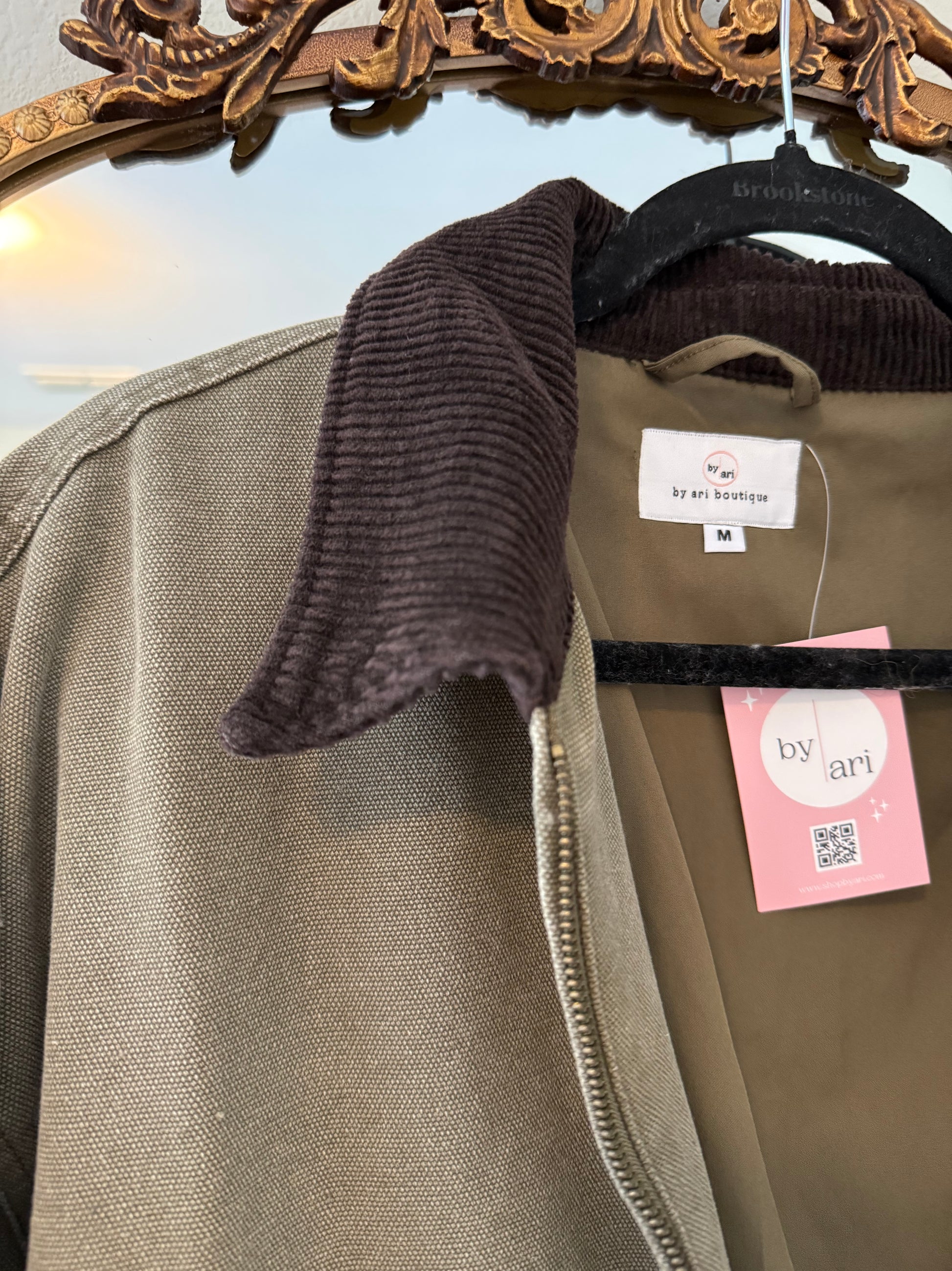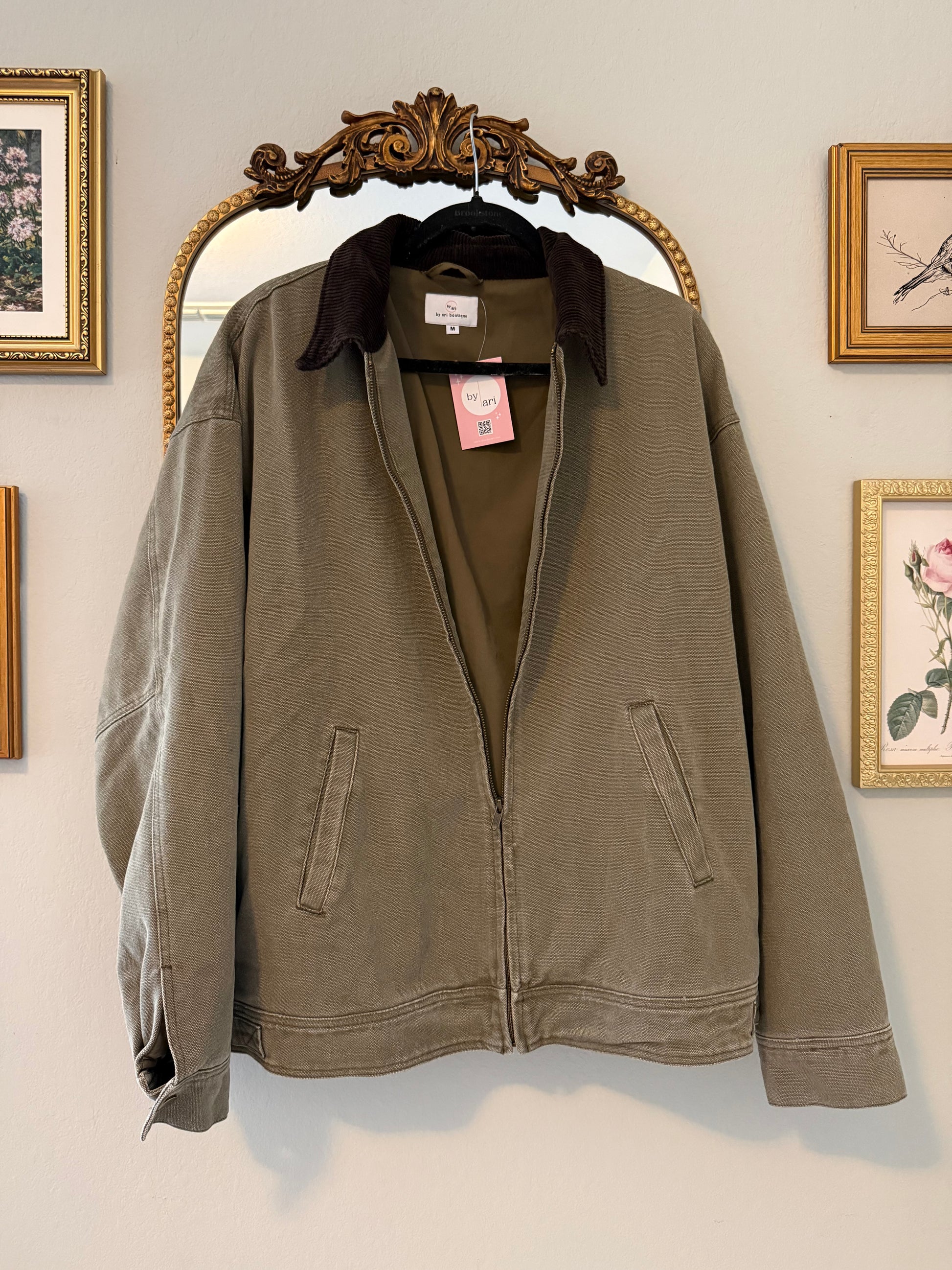The Elliot Barn Jacket is your new go-to layer — relaxed, timeless, and effortlessly cool. Designed with a soft corduroy collar, zip-front closure, and an intentionally oversized fit, this jacket gives that perfectly lived-in feel while still looking put together.