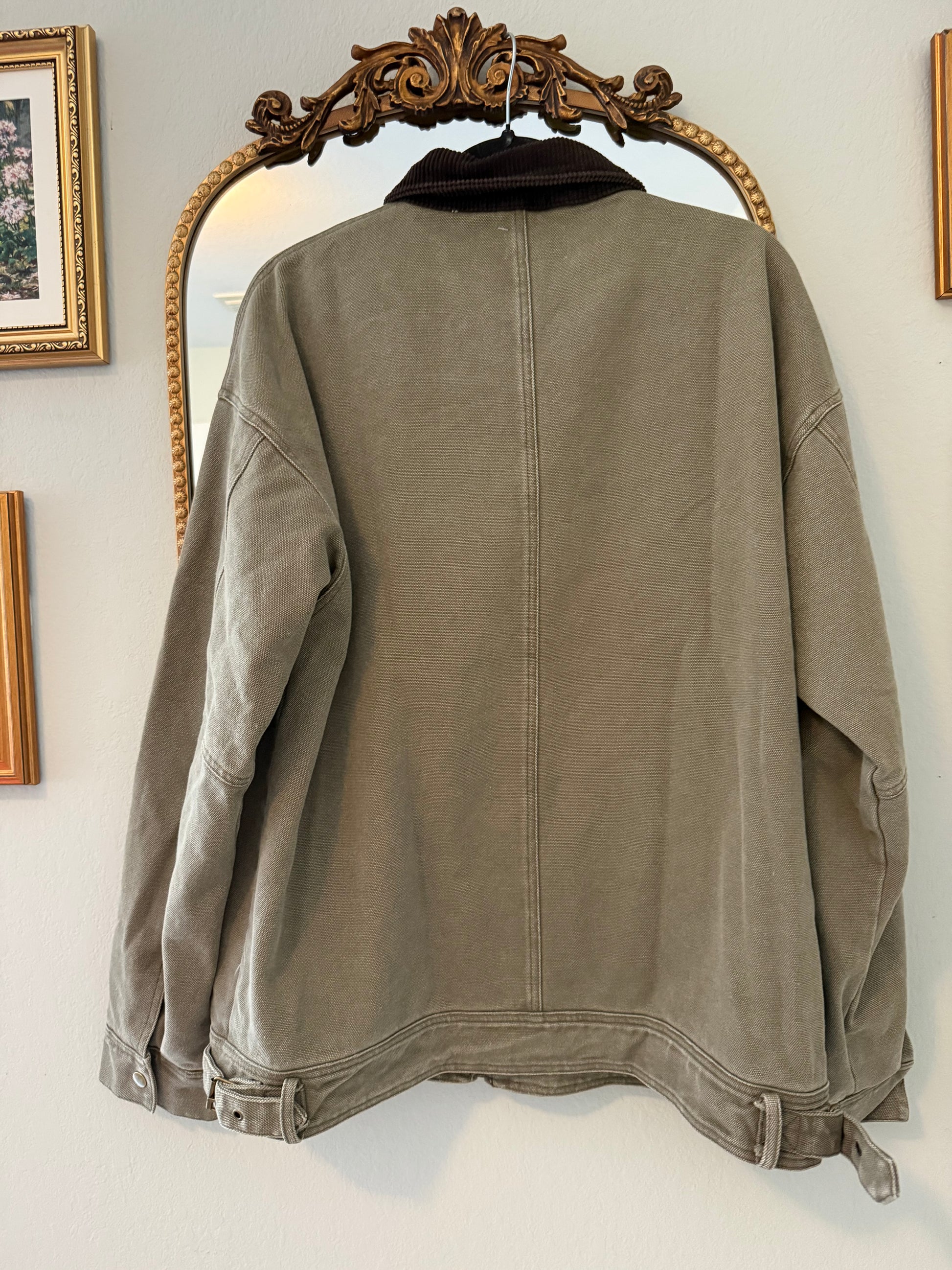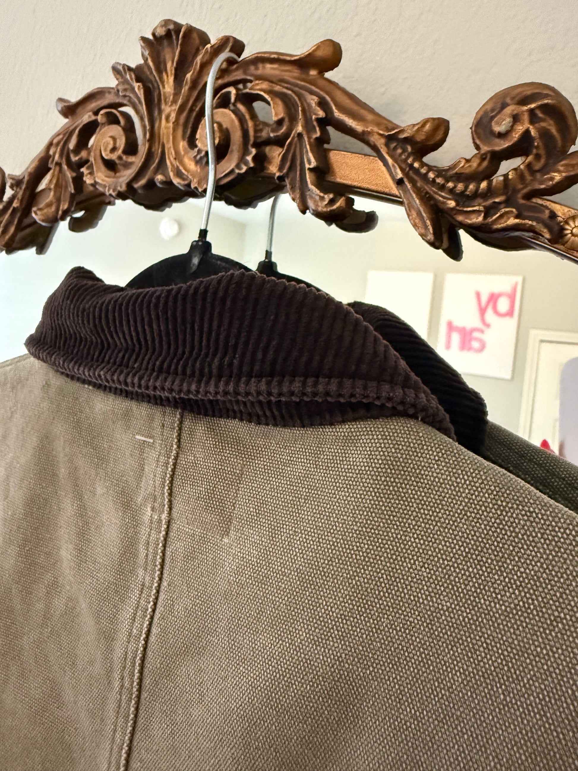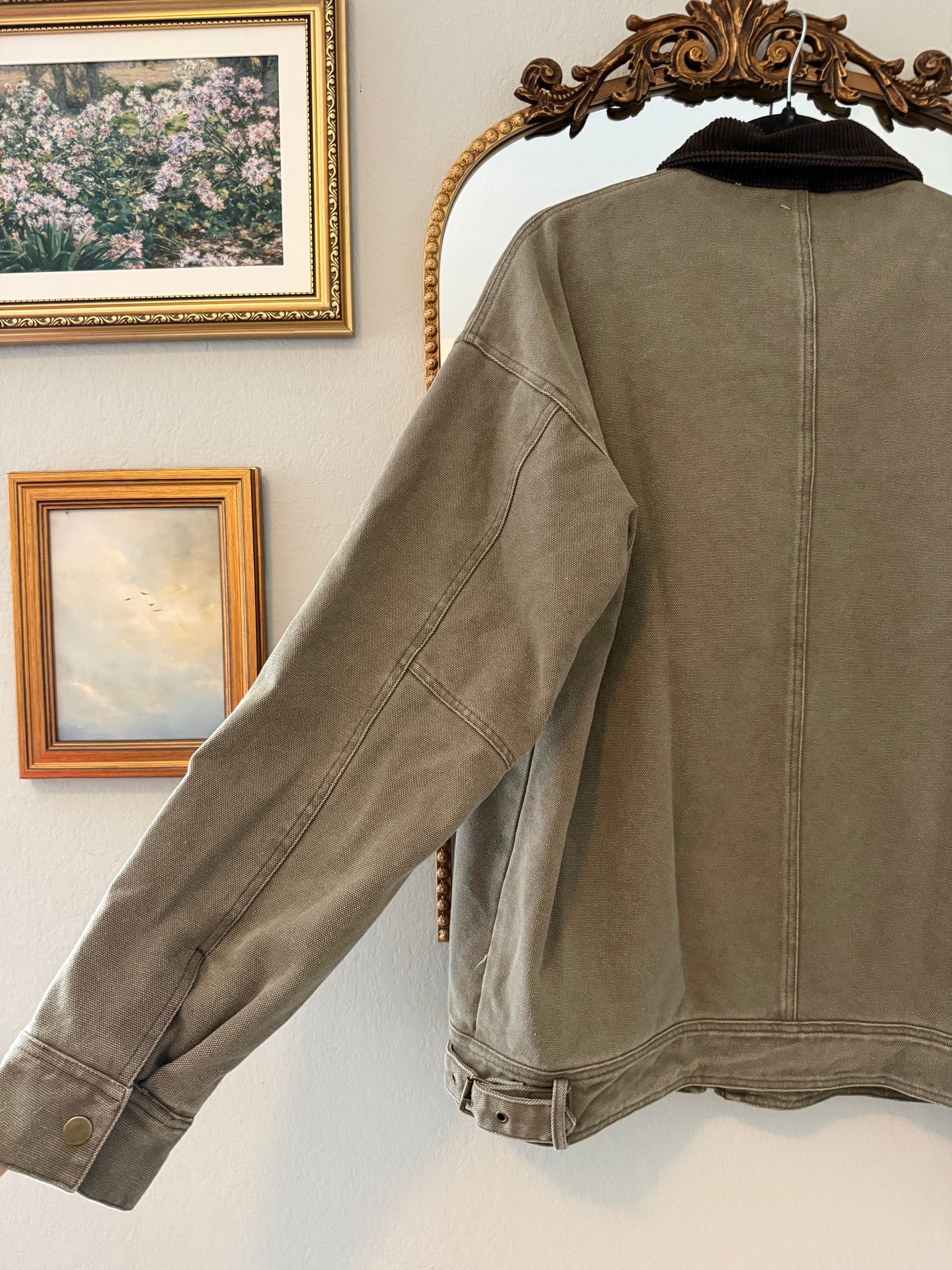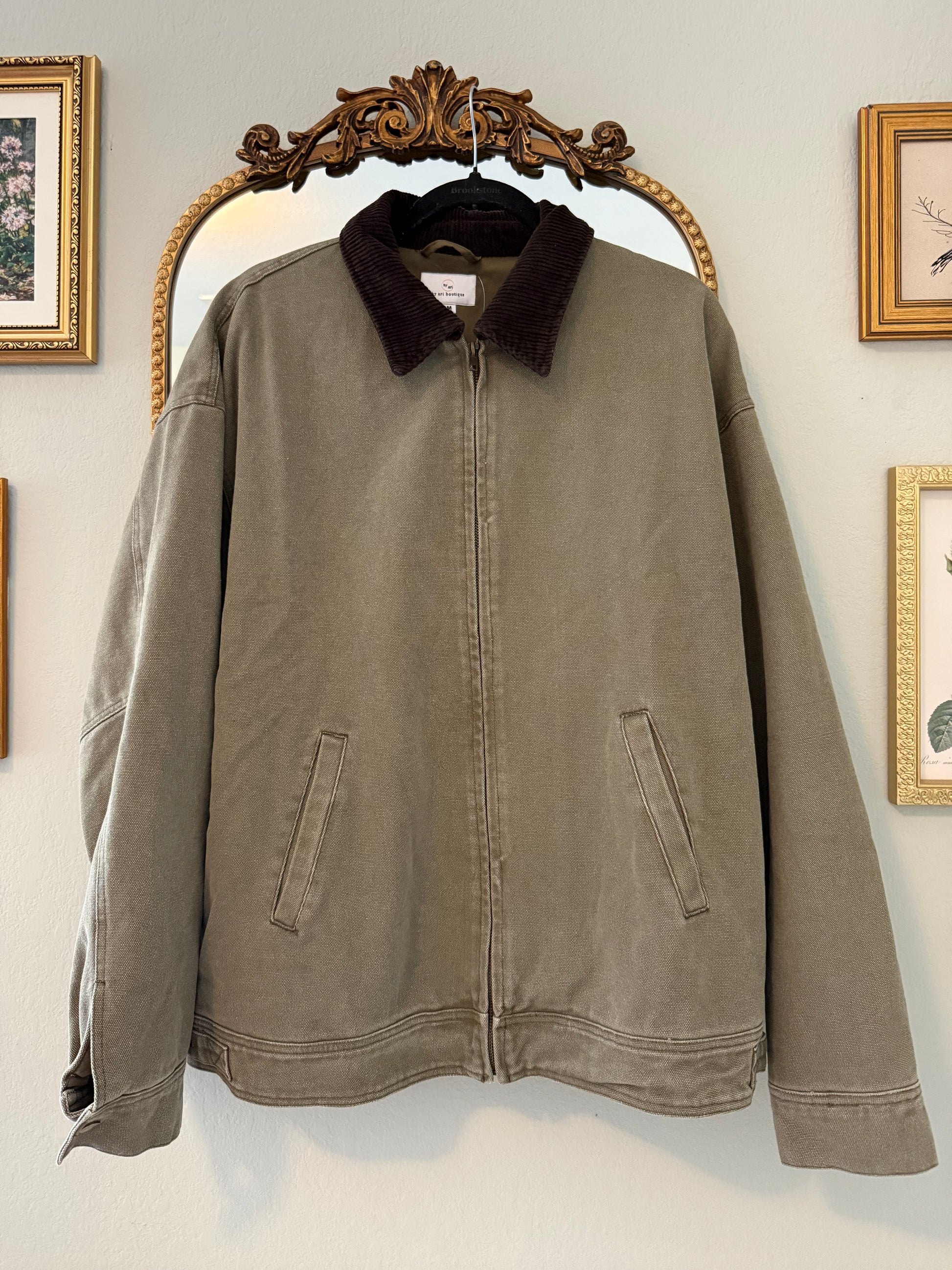 The Elliot Barn Jacket is your new go-to layer — relaxed, timeless, and effortlessly cool. Designed with a soft corduroy collar, zip-front closure, and an intentionally oversized fit, this jacket gives that perfectly lived-in feel while still looking put together.