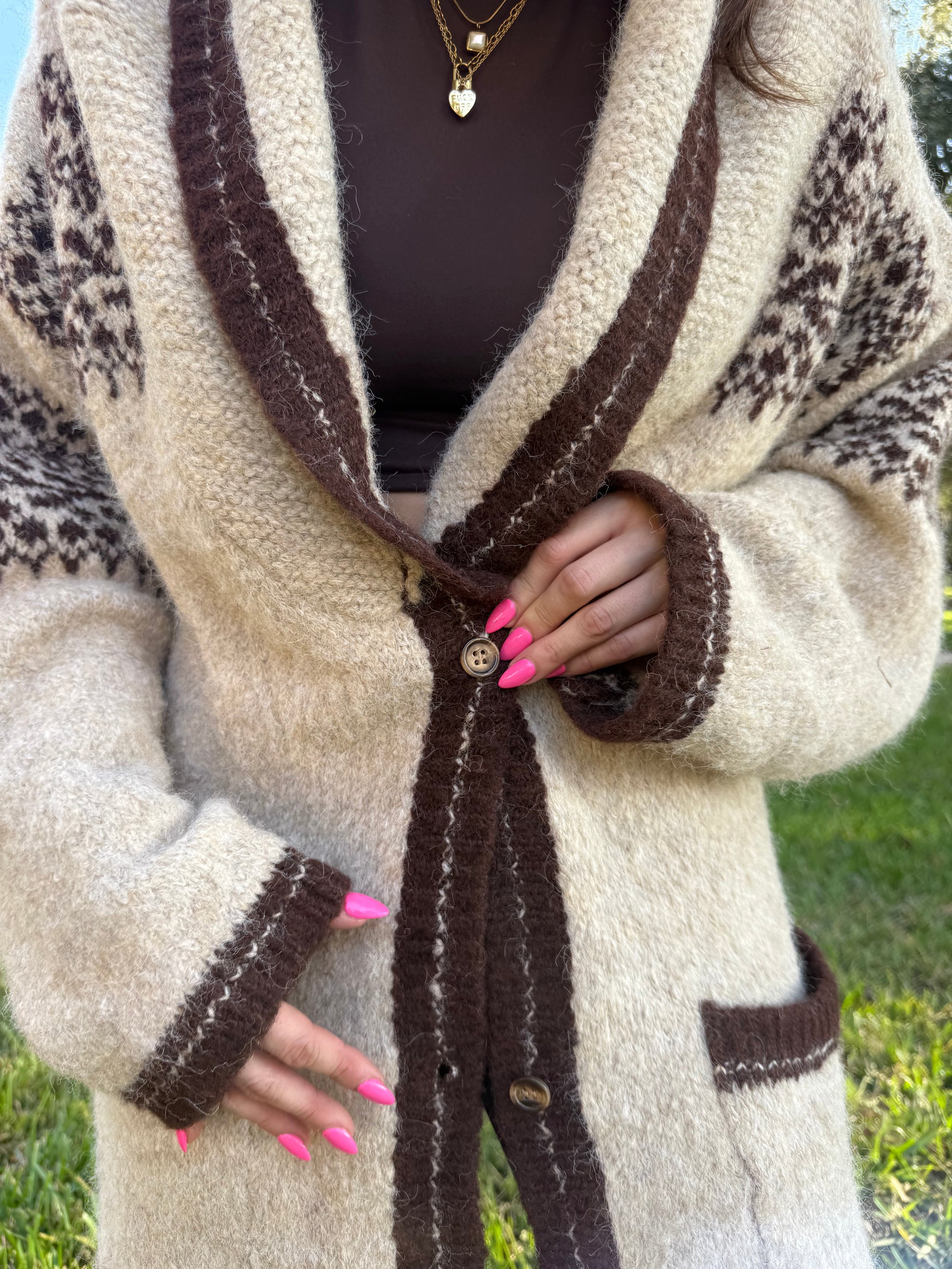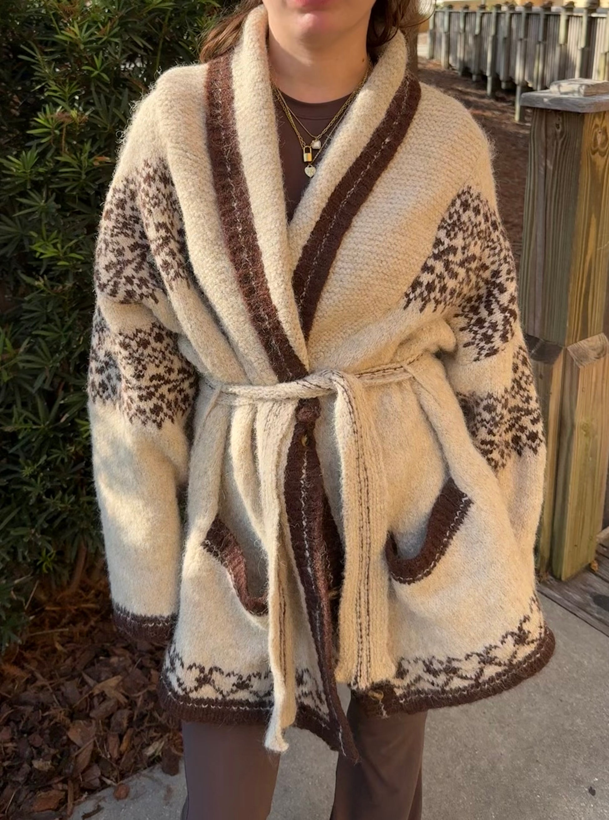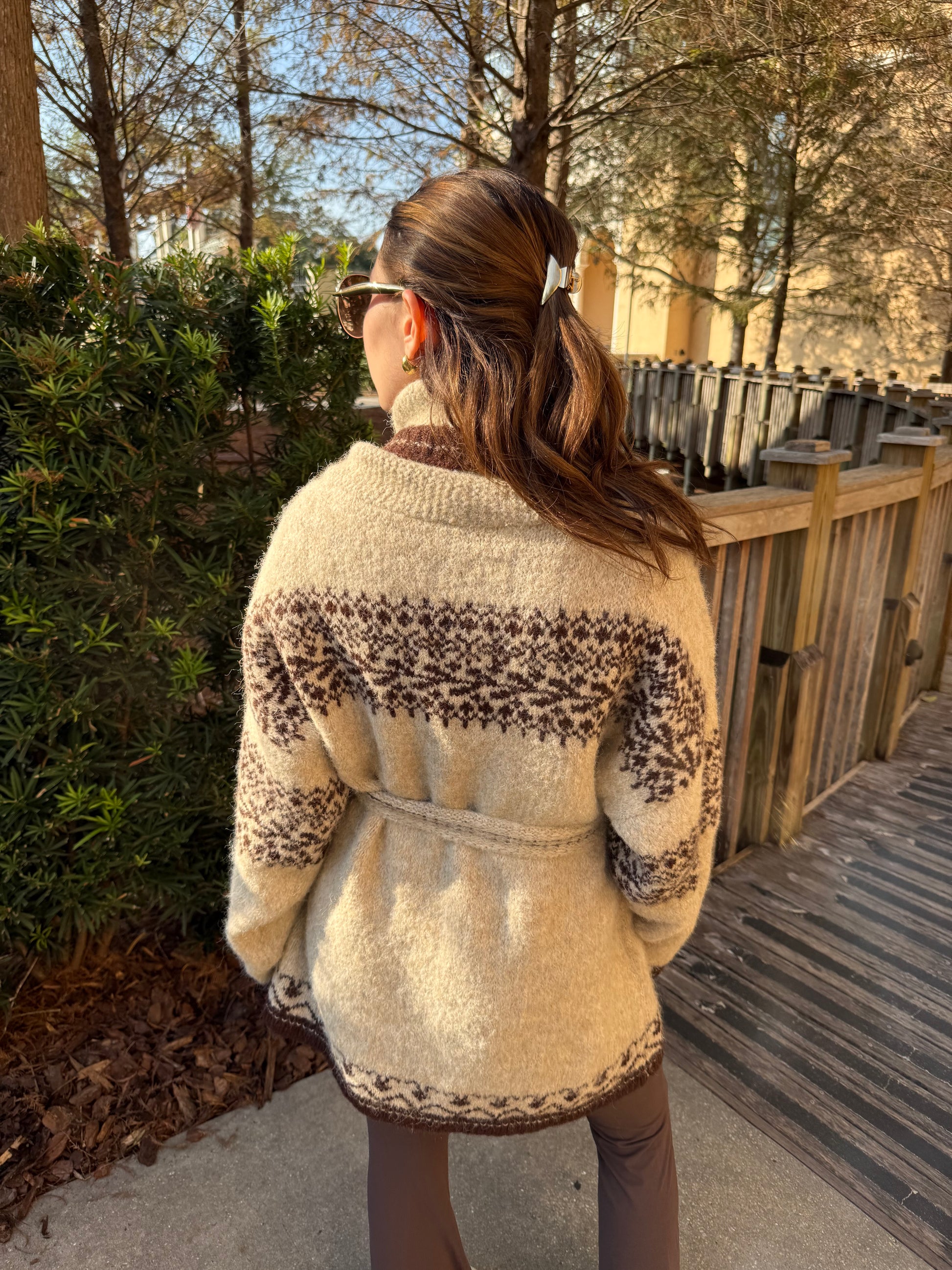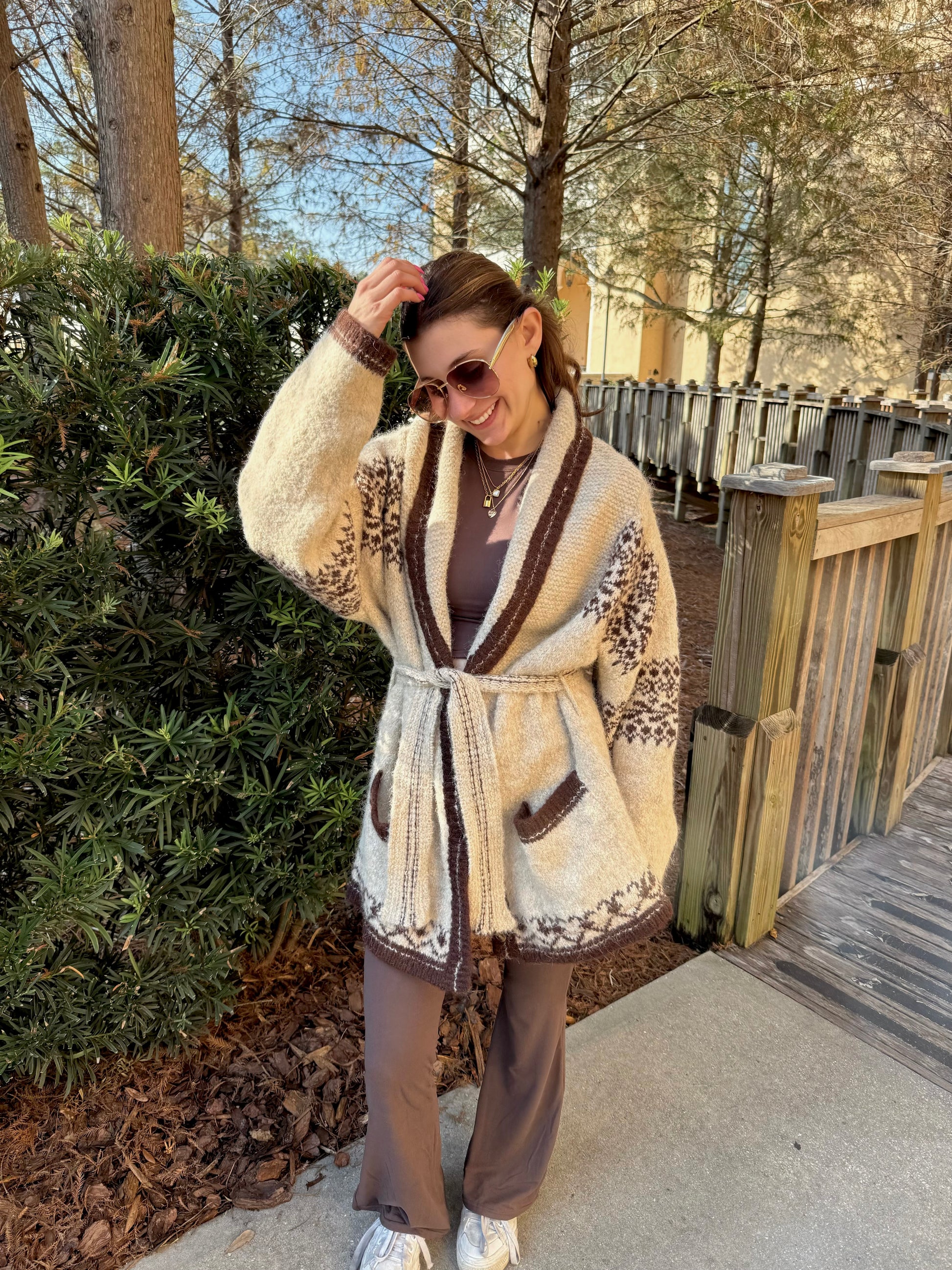The Aspen Cardigan is that dreamy, cozy knit your winter wardrobe needs. Made from a soft, heavyweight fabric with a classic fair-isle inspired pattern, she gives you that warm, effortless, elevated feel the moment you put her on. The relaxed shawl collar, functional button closure, and matching tie belt make her easy to style while keeping the look polished and timeless.