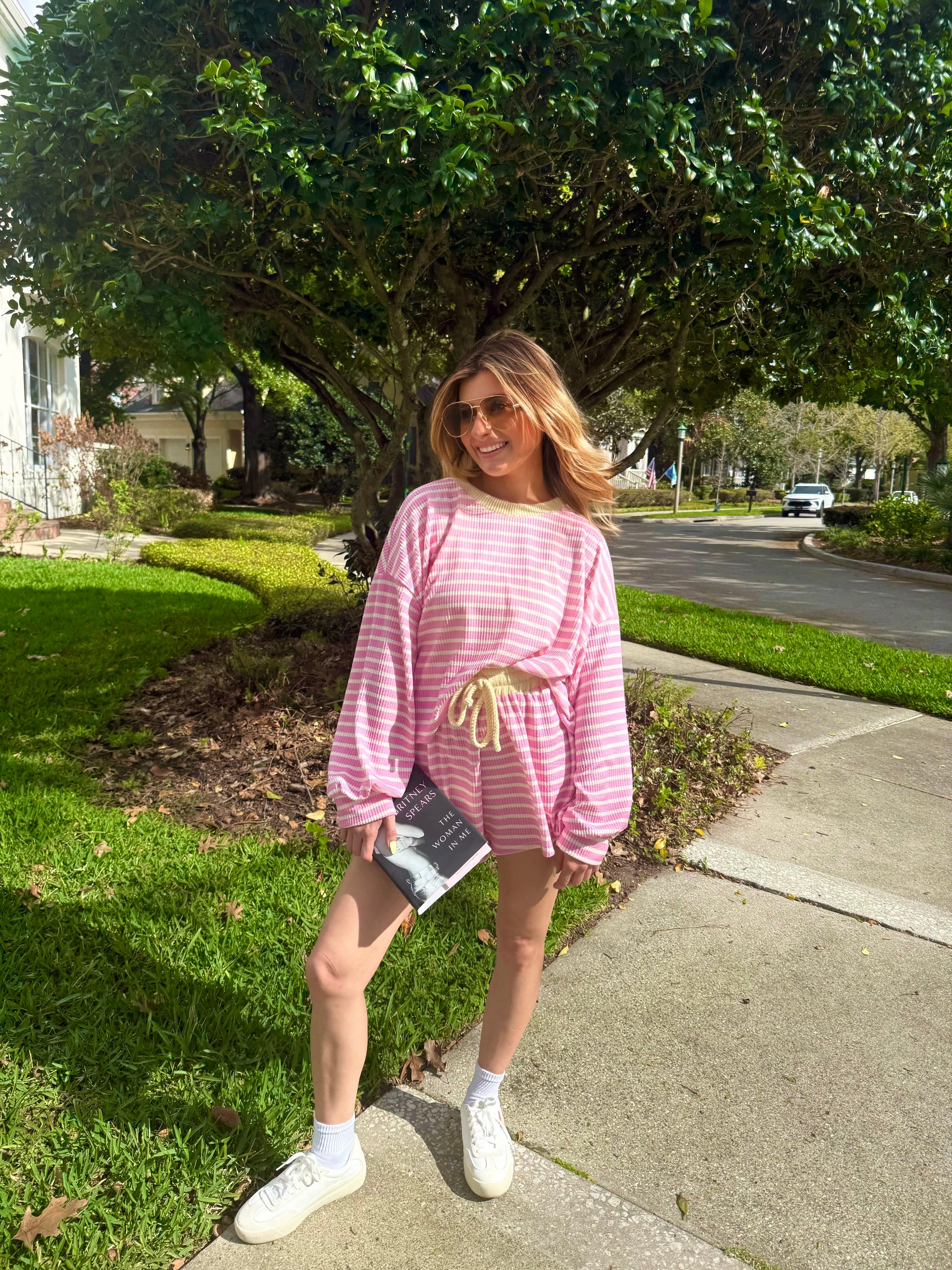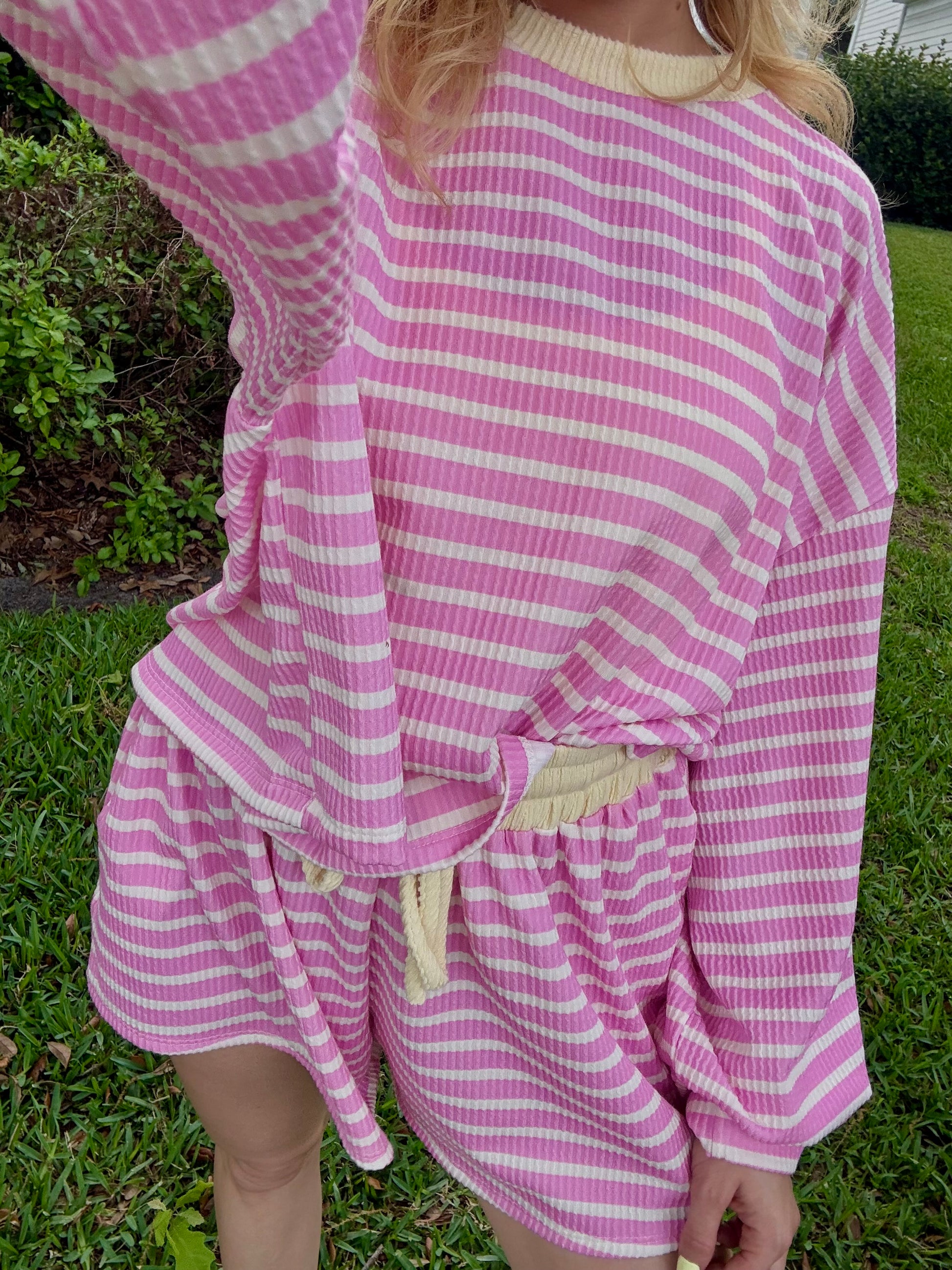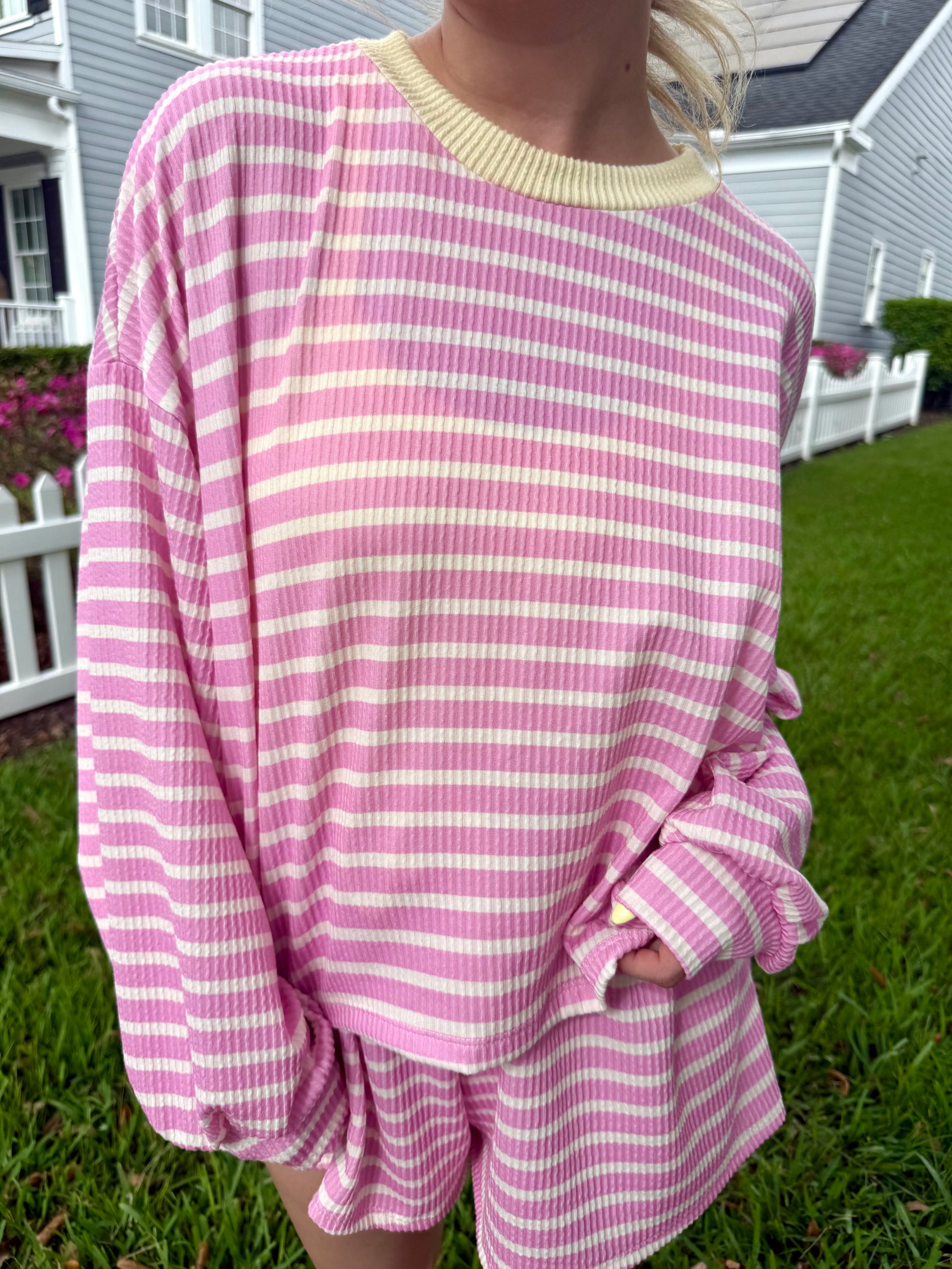 The Blush & Butter Stripe Top is the sweetest little lounge piece for spring. With soft blush pink stripes and buttery yellow trim, it feels playful, cozy, and easy to wear. The lightweight waffle knit and relaxed fit make it perfect for slow mornings, coffee runs, or pairing with the matching shorts.