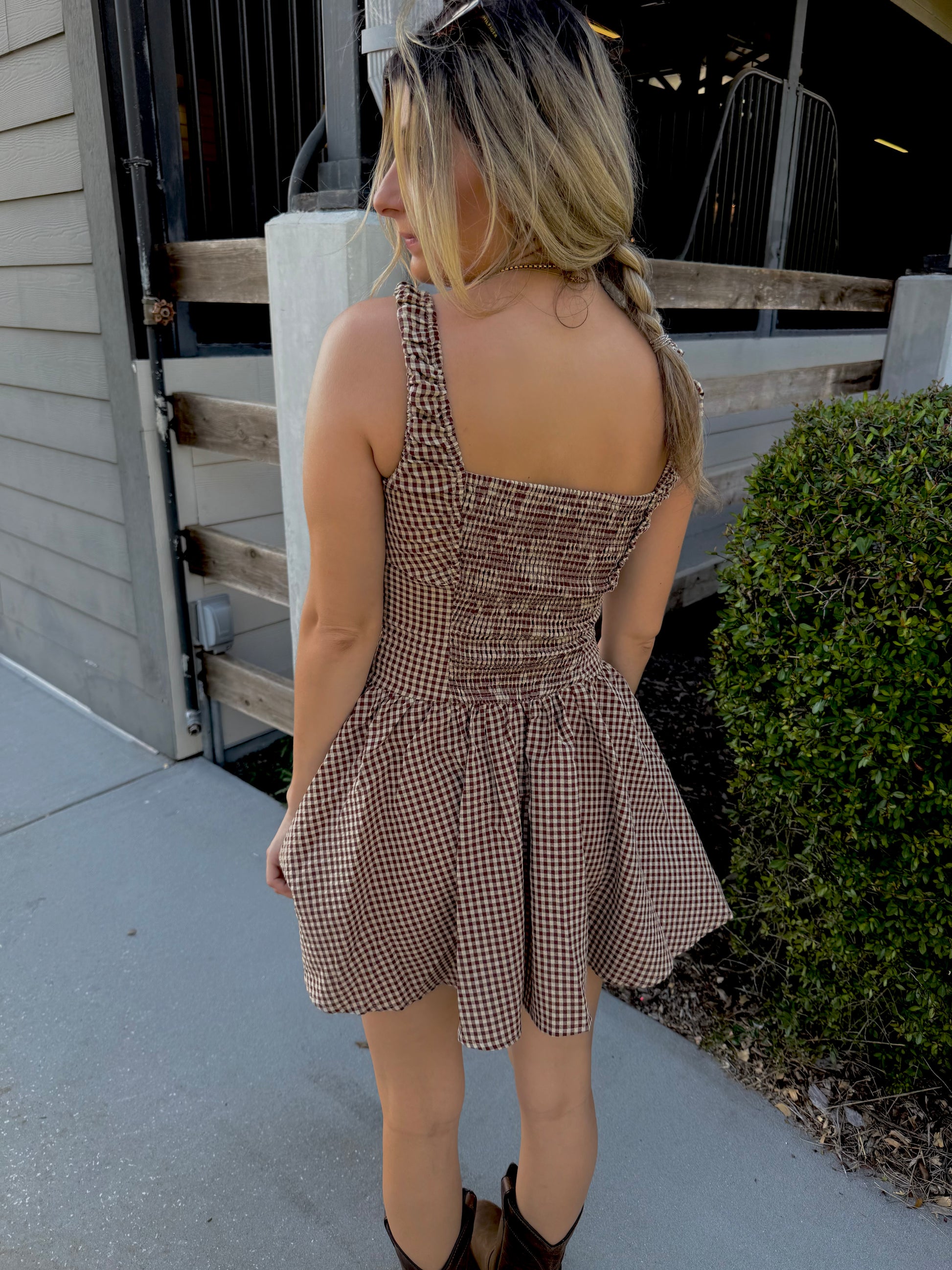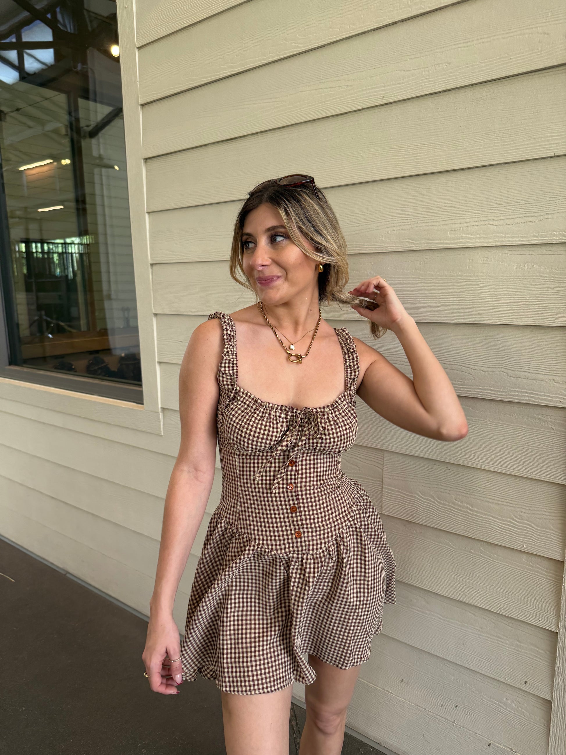 The Autumn Mini Dress is your new fall favorite — a soft brown gingham mini with delicate ruffle straps and a tie-front detail that creates the perfect feminine shape. Lightweight and double-lined, she’s designed to move effortlessly from daytime plans to cozy fall nights.