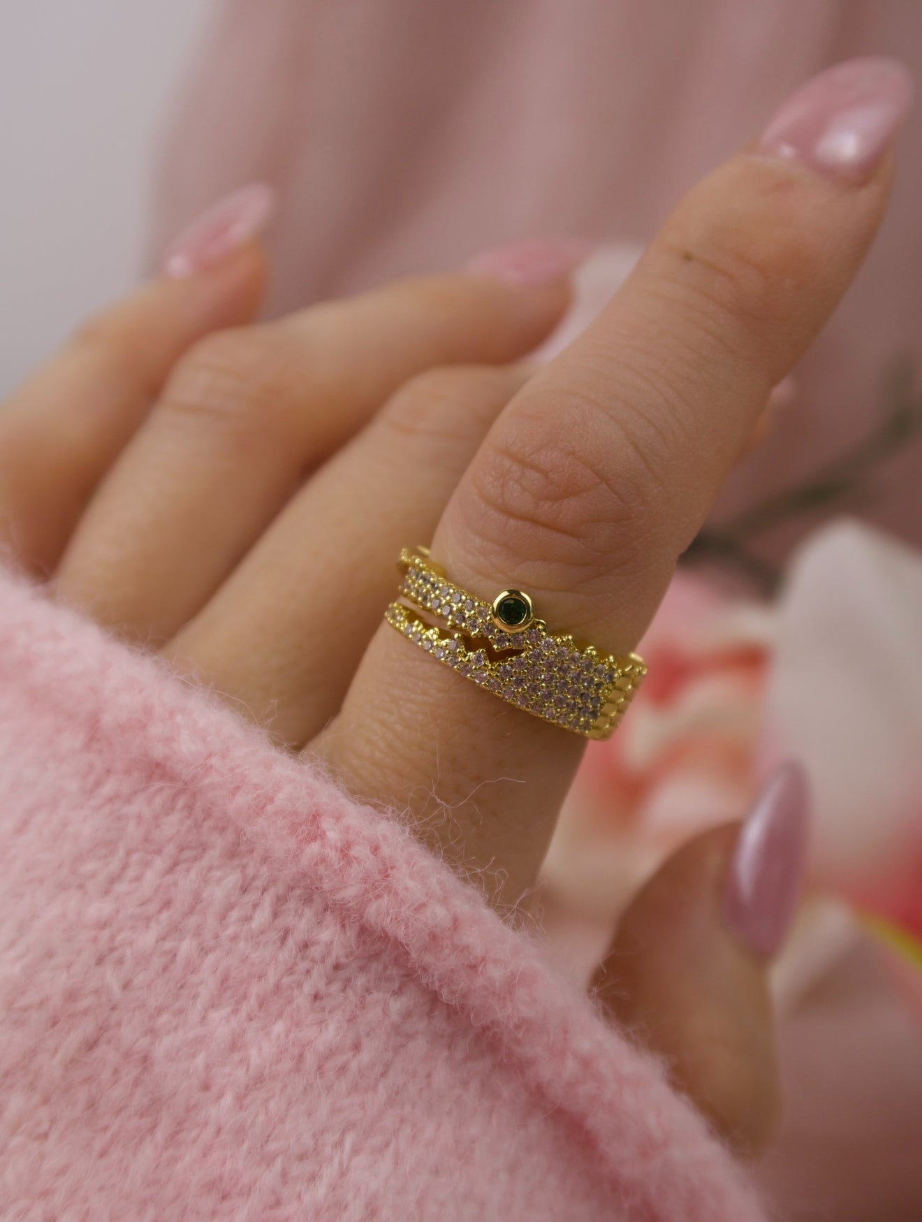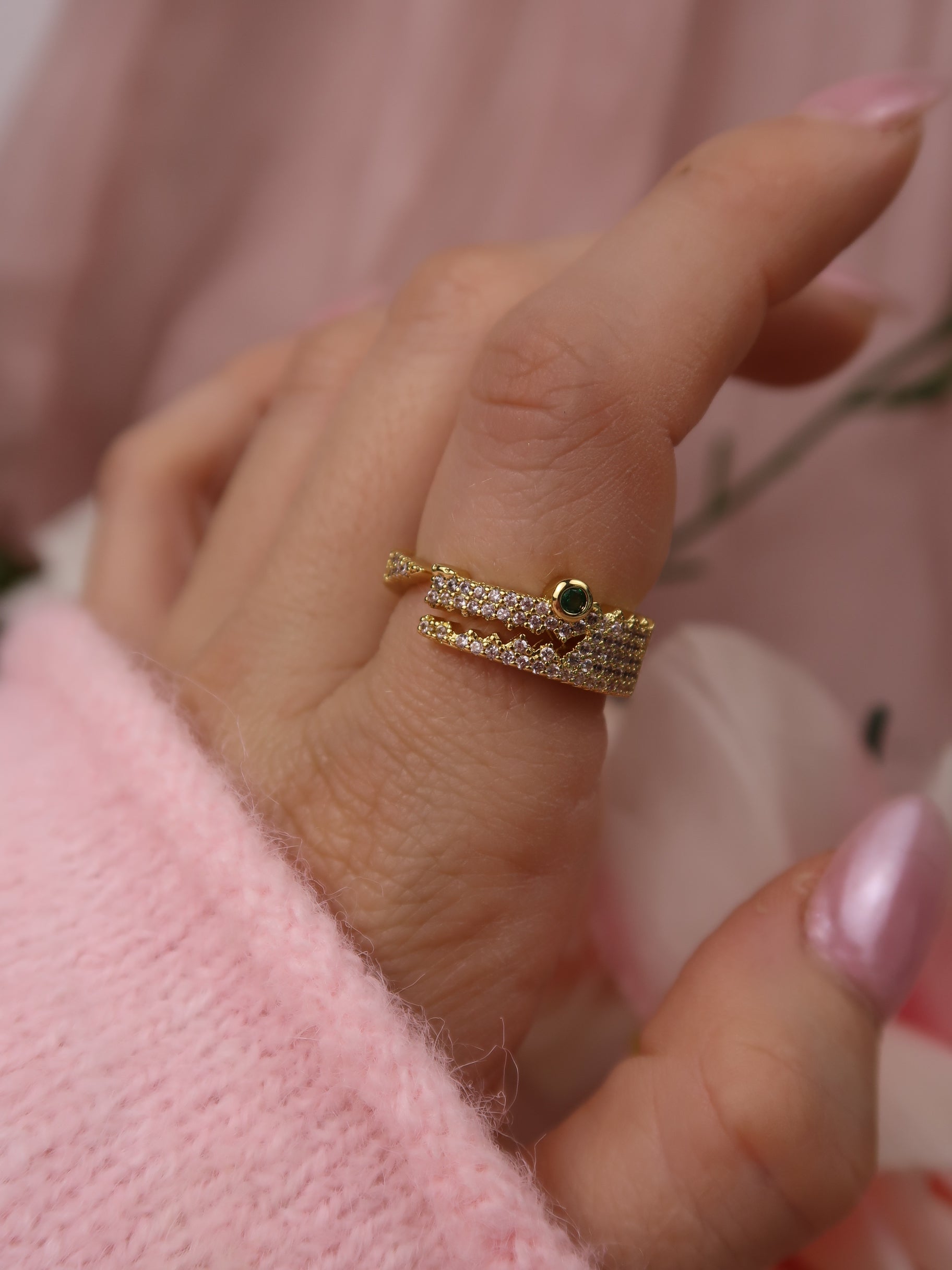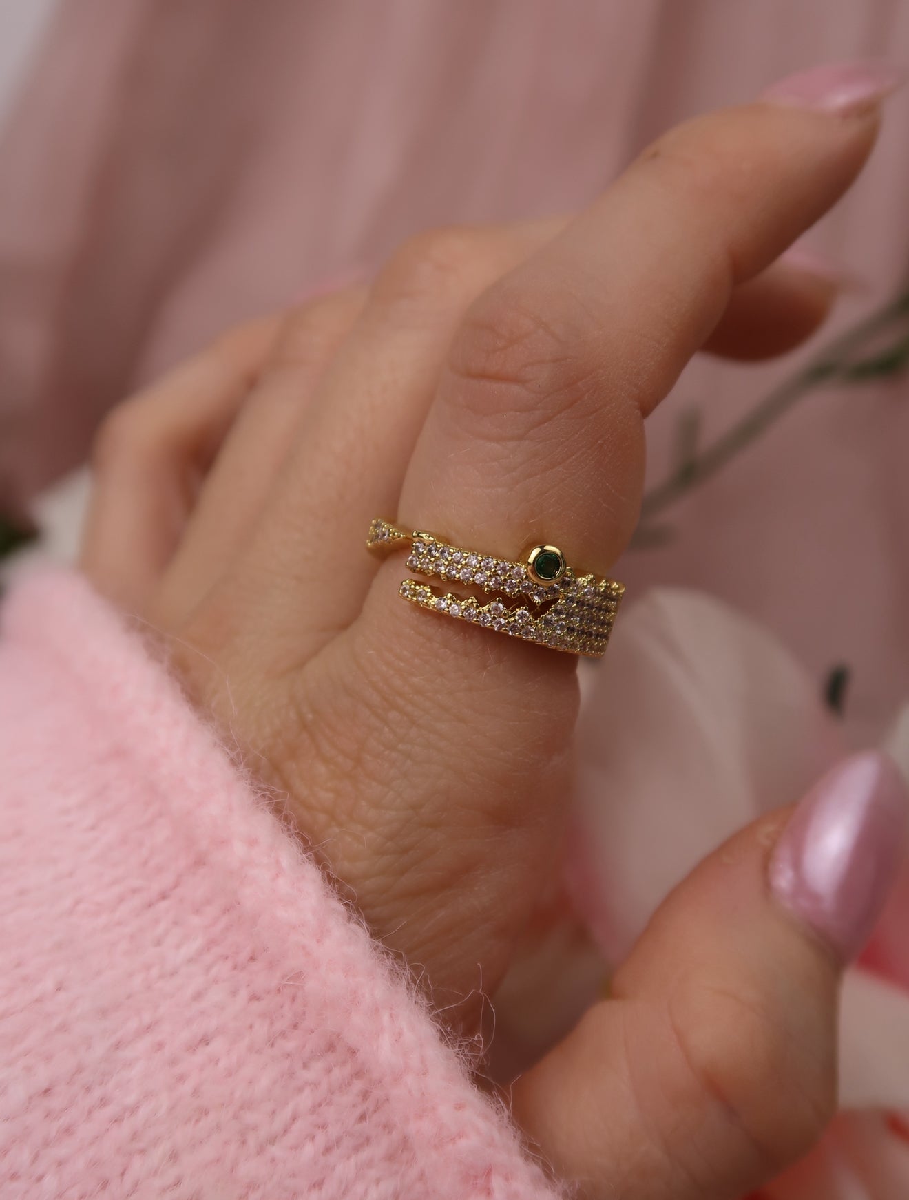 For the girls who bite back 🐊 The Gator Glimmer Ring features a bold crocodile silhouette wrapped in a sleek gold finish, complete with micro crystal details and a striking emerald green eye. Designed to wrap gently around your finger with a comfortable open fit, this ring is a conversation starter that still stacks beautifully with your daintier pieces.