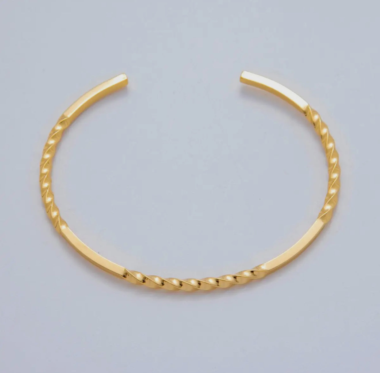 The Golden Twist Cuff features a sleek twisted band design with a smooth, minimalist finish. Crafted in gold-filled brass, this lightweight cuff is easy to slip on and perfect for everyday wear. Wear it alone for a clean look or stack it with your favorite bracelets for a subtle statement.