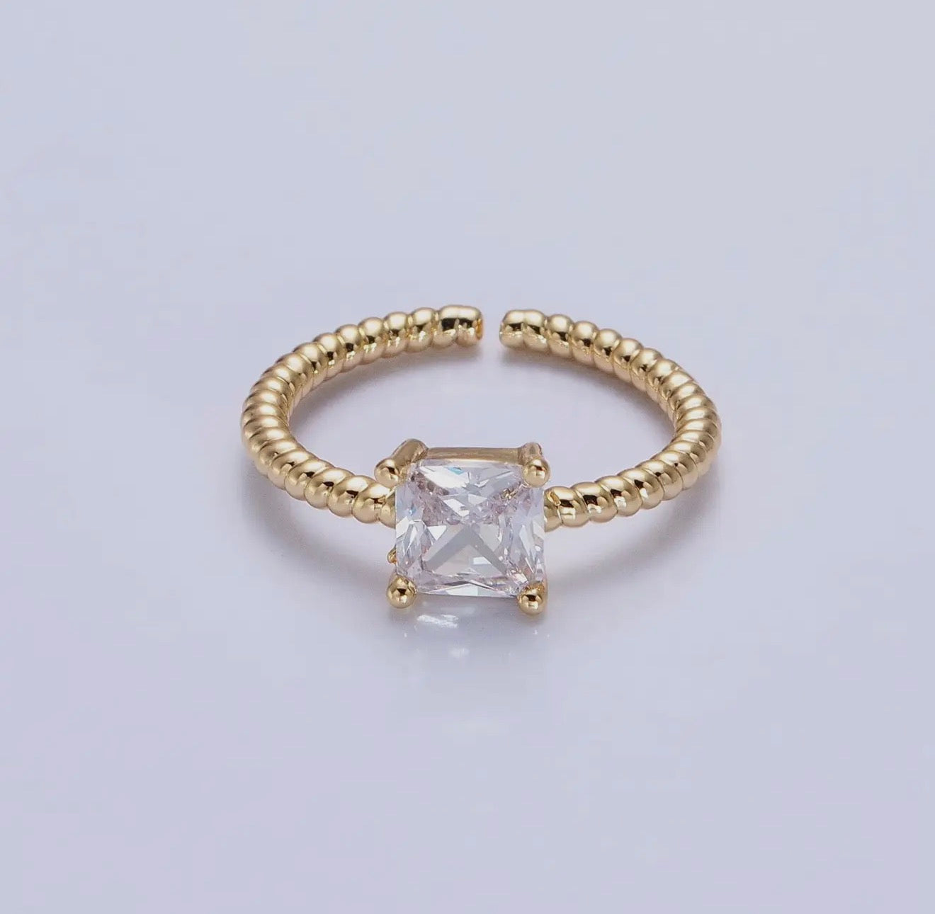 The She Said Yes Ring features a clear square CZ stone set on a delicate beaded band with a polished gold finish. It’s that perfect just-engaged energy — effortless on its own, dreamy stacked with your everyday rings.